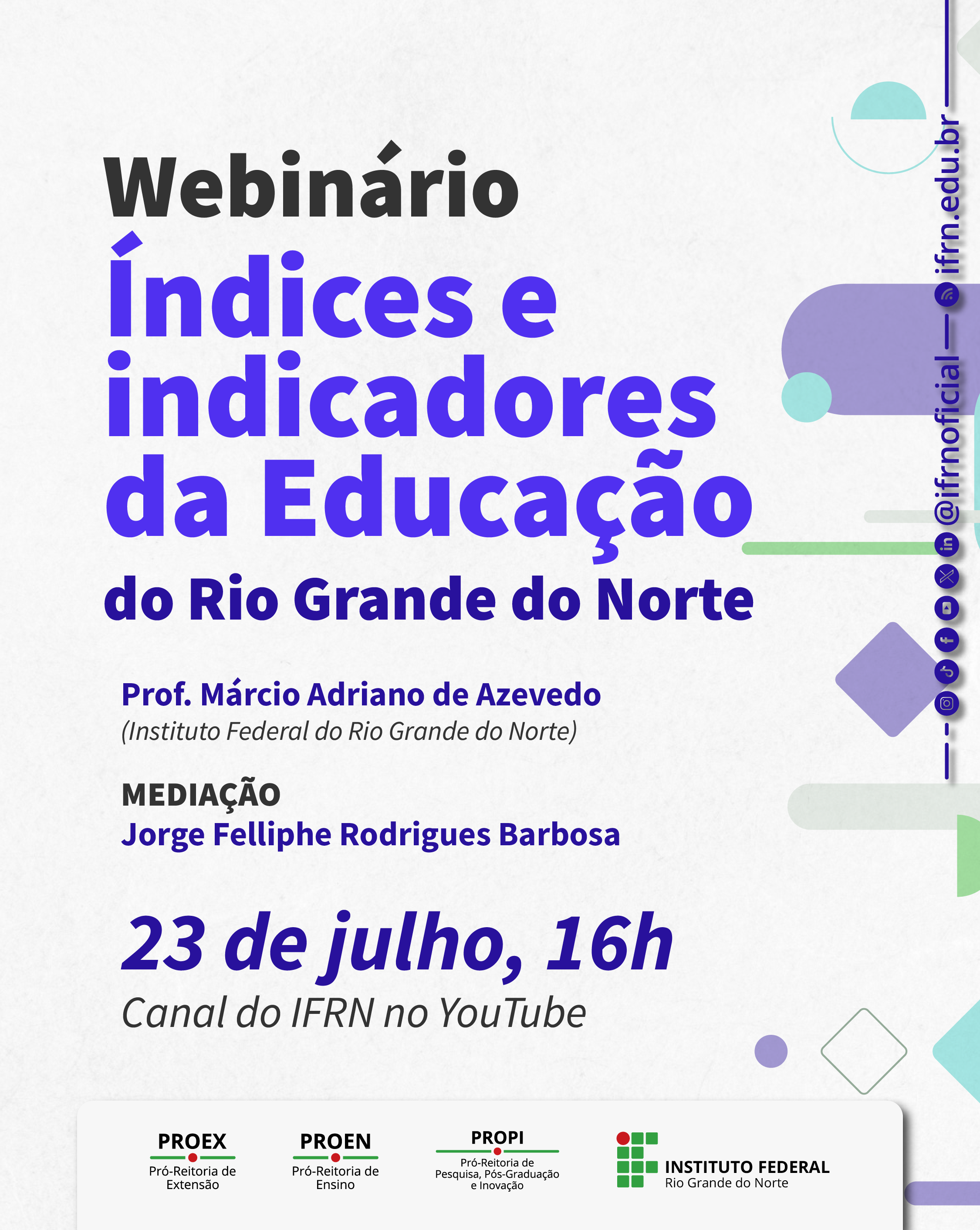 Divulgamos o Webinário com o tema Índices e indicadores da Educação do Rio Grande do Norte, proferido pelo Prof. Dr. Márcio Adriano de Azevedo (IFRN). O evento promovido pela Arquidiocese de Natal e o IFRN ocorrerá em 23 de julho de 2025, às 16h, com transmissão ao vivo no Canal do IFRN Oficial no Youtube.
